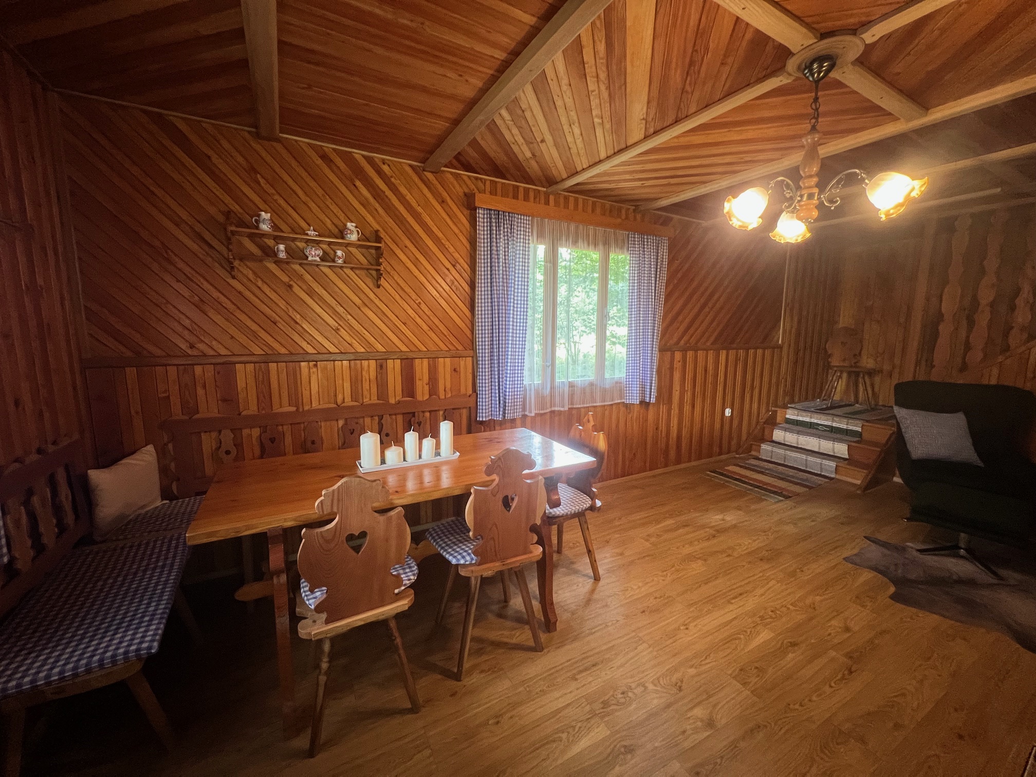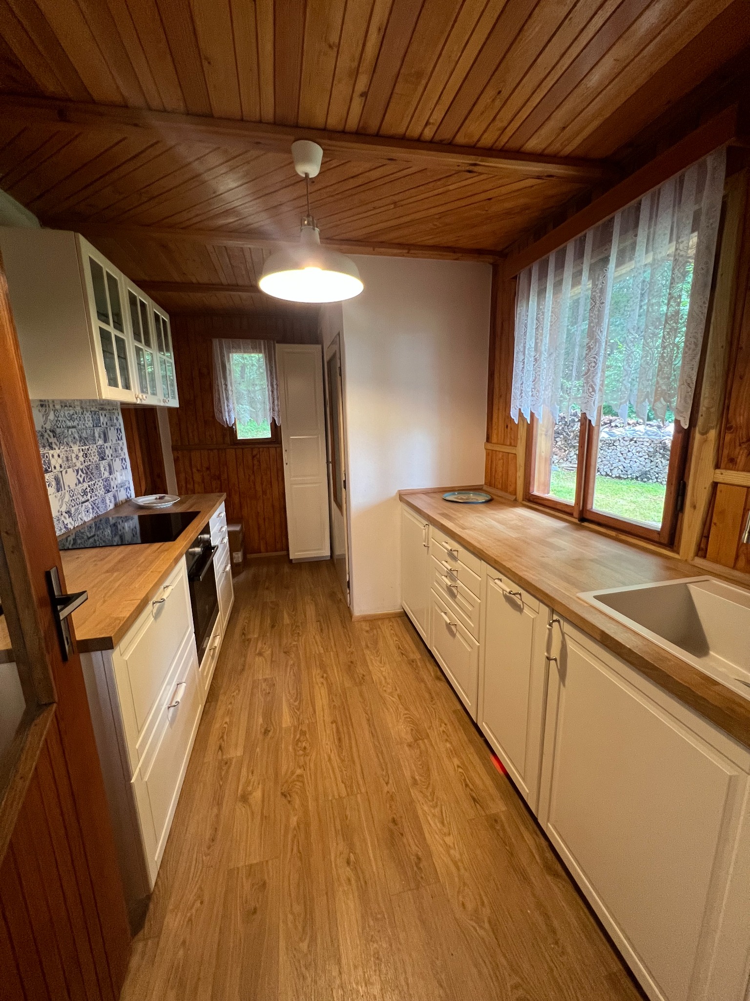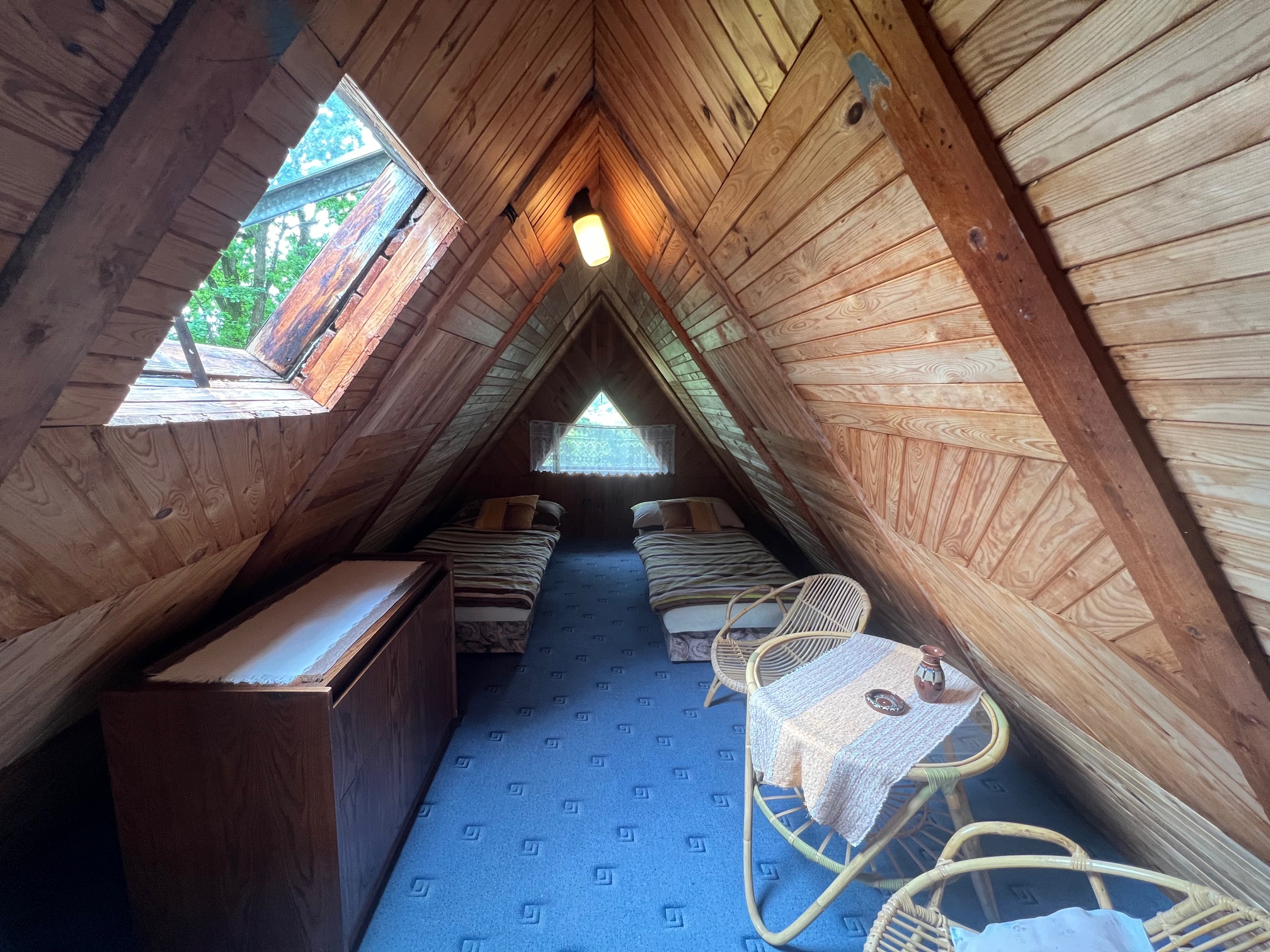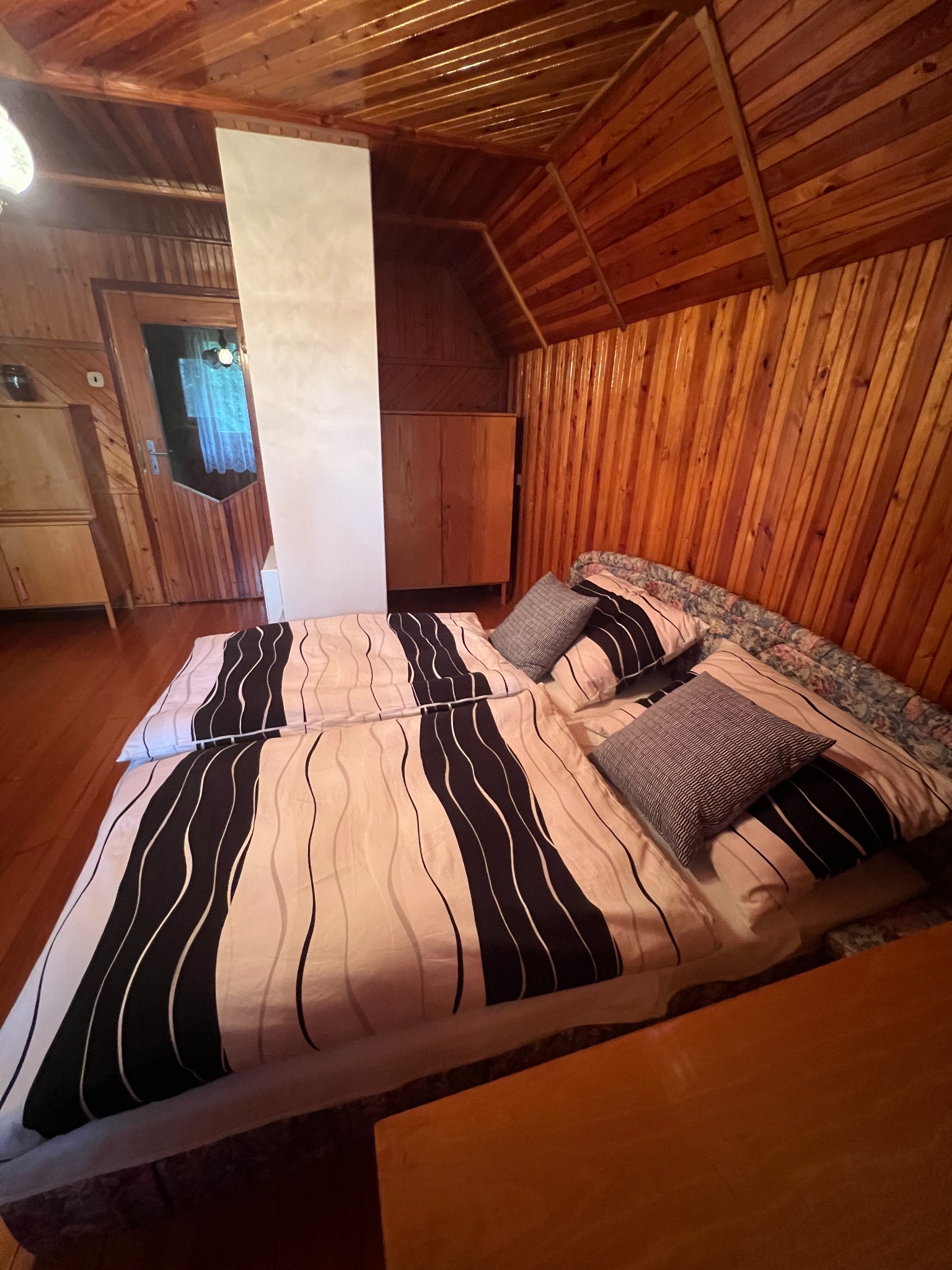 Chatu nabízíme těm, kteří potřebují odpojit hlavu od obrazovek a zase jednou cítit, jaké to je být venku. Záměrně zde není televizor ani internet – vyměníte je za vůni pryskyřice, praskání krbu a večerní oblohu plnou hvězd. V přízemí je technické zázemí a nová koupelna se sprchou, v 1. patře kuchyně s jídelním koutem a obývací pokoj s krbem. V podkroví najdete čtyři lůžka a útulný čtecí koutek. Hlavní ložnice nabízí manželské lůžko a pohovku.